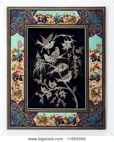 خاتم، خاتم کاری، صنایع دستی، چوبی، ایران، اصفهان، پرنده، گل و مرغ، چوگان، هنر اسلامی، هنر ایرانی، سوارکاری، اسب سواری، قاب، هنر، انتزاعی، مینیاتور