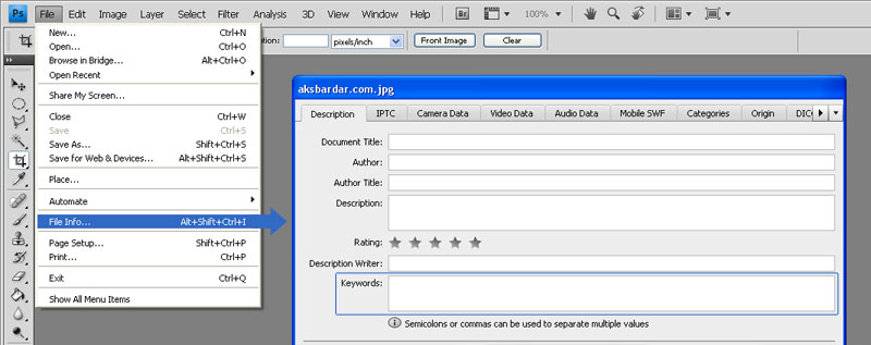 Menu-> File-> File Info-> Keywords
