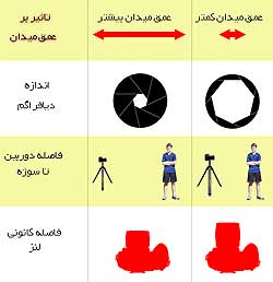 اندازه دیافراگم : هرچه دیافراگم بسته تر باشد عمق میدان بیشتر و هرچه دیافراگم بازتر باشد عمق میدان کمتر میگردد .