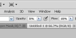 - حالا با ابزار Brush قسمتهایی میخواهید ترمیم شود کلیک کنید، با هر بار کلیک %۳۰ از آن قسمت را شفاف تر میکنید و لایه زیرین دیده میشود.